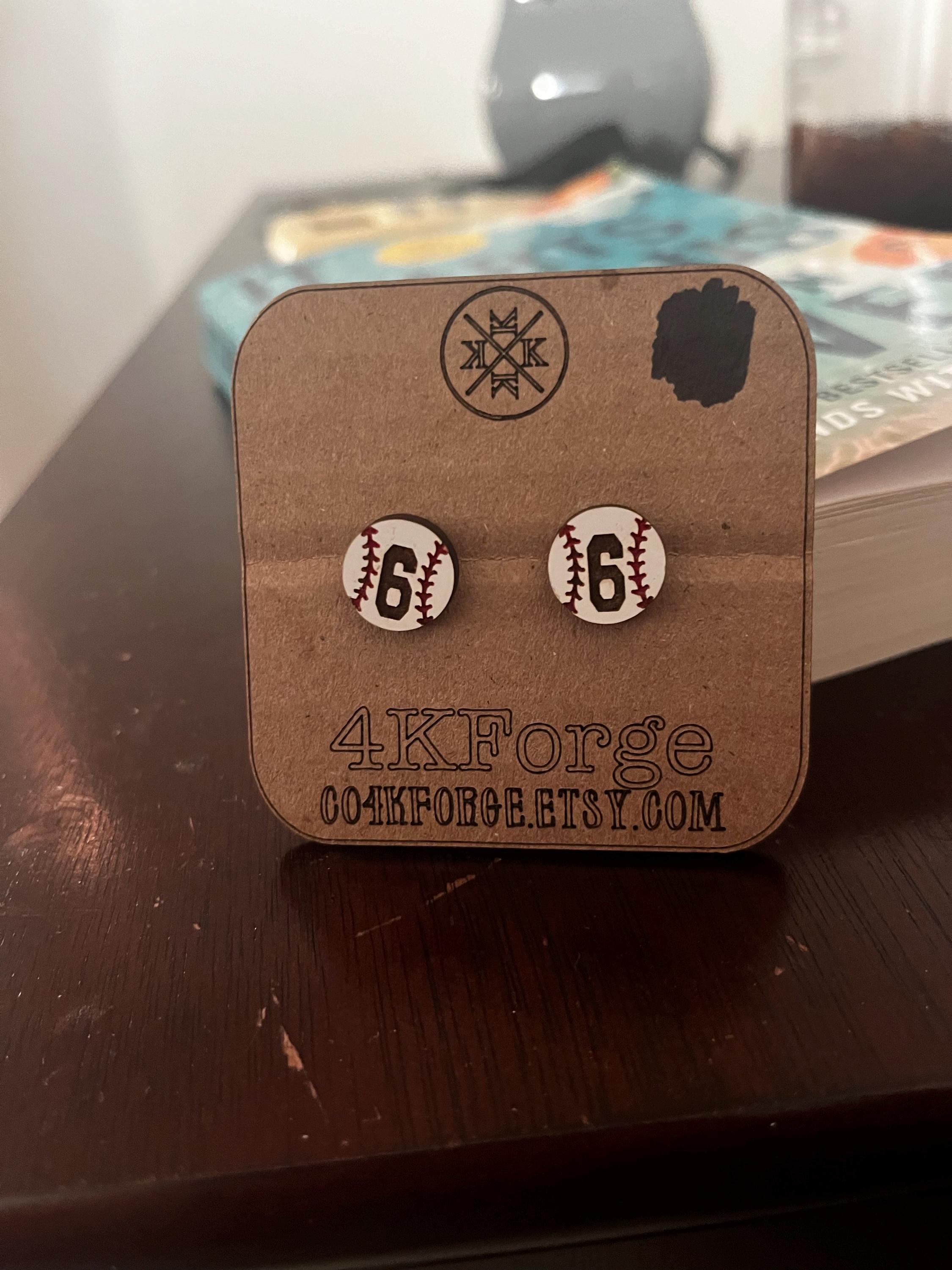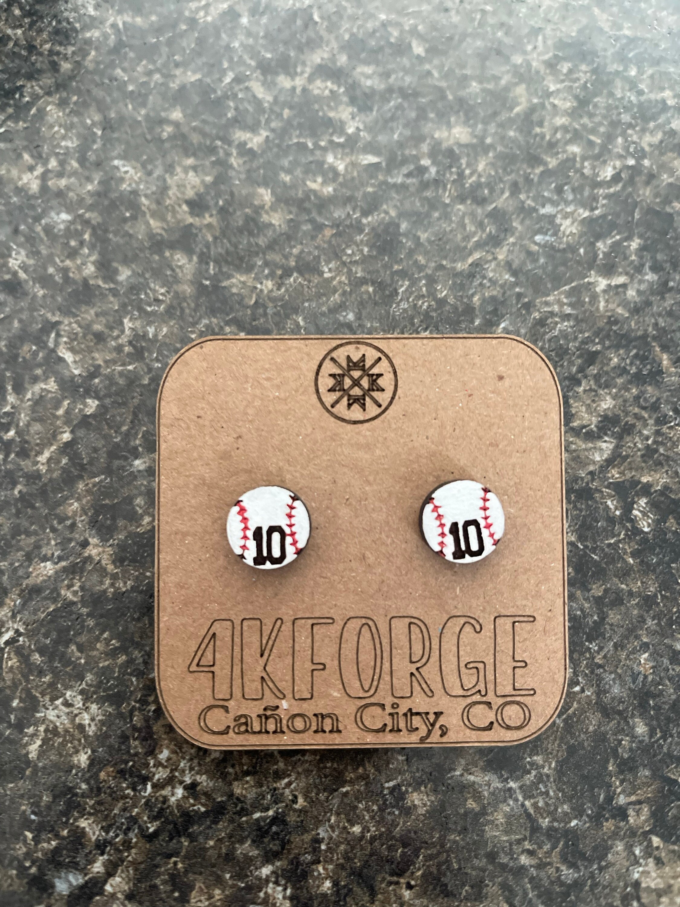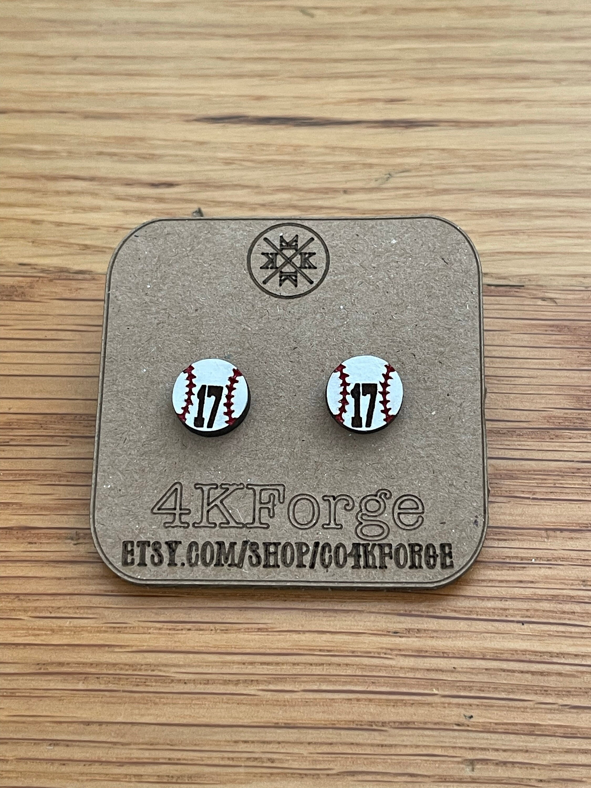 Baseball is back!!!!! Personalizable baseball wooden stud earrings laser engraved on lightweight 1/8" wood for comfortable wear. Optional personalization with your/your player's number.